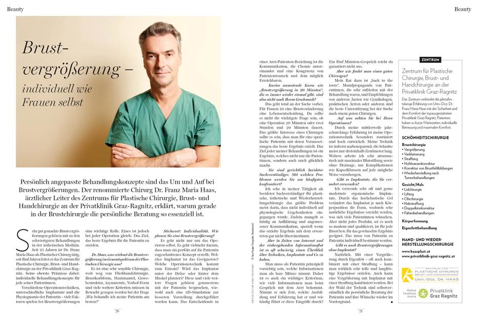 Mehr als nur Ästhetik. Die Plastische Chirurgie umfasst ein sehr breites medizinisches Spektrum und erfordert viel Erfahrung, Feingefühl und Liebe zum Detail. Im Gespräch mit Univ.-Doz. Dr. Franz Maria Haas, Leiter des Zentrums für Plastische Chirurgie an der Privatklinik Graz-Ragnitz, haben wir einiges über Trends und Innovationen erfahren.